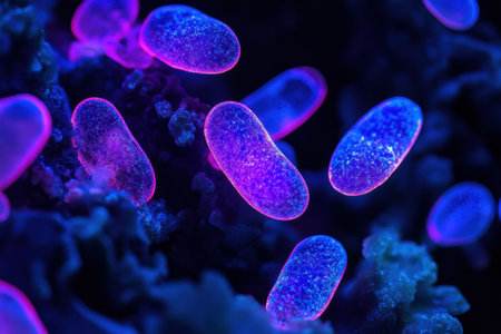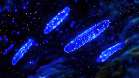 Under ultraviolet light, bacteria emit a vibrant glow, revealing their bioluminescent properties in a dark, captivating setting.