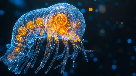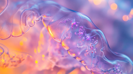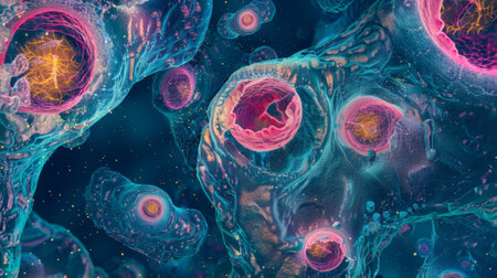 Intricate world of living cells in this closeup, showcasing glowing organic structures on a stunning blue background, revealing lives microscopic beauty