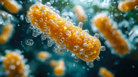A close-up of golden probiotic bacteria floating in liquid with tiny bubbles. Microbiology and gut health concept with vibrant detail.