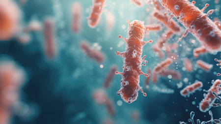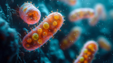 a detailed microscopic view of numerous bacteria cells with orange and red highlights in a blue environment