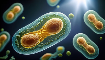In depth look at dividing bacteria, highlighting key biological processes and structures.