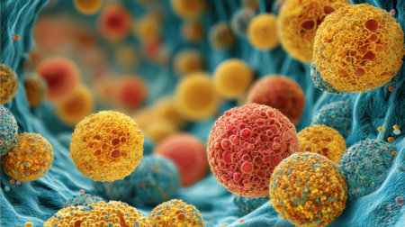 A stunning close-up of colorful cells, showcasing intricate patterns and textures. The vibrant colors and details illustrate the beauty of microscopic biology in an abstract way. Generative AI