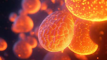 This vibrant abstract image showcases glowing microbial cells in shades of orange and yellow, highlighting their unique textures and forms, perfect for scientific themes.