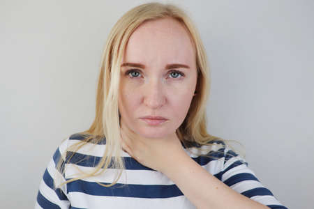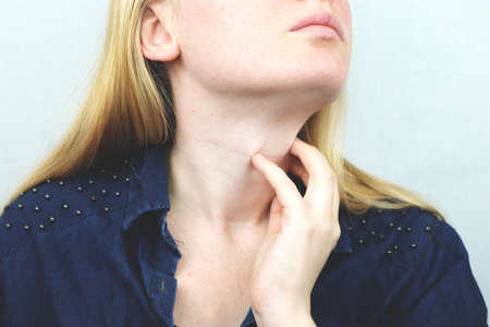 Woman have a sore throat. Female touching neck with hand. Healthcare Concepts