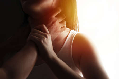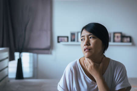 Woman have a sore throat,Female touching neck with hand,Healthcare Concepts
