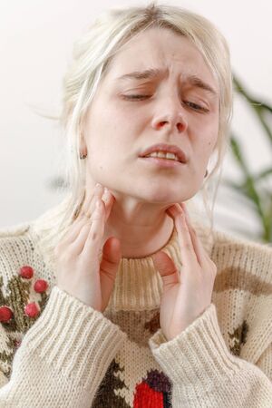 The girl touches the upper part of the neck. Pain is visible on her face. Inflamed lymph nodes due to the common cold, influenza virus, or coronovirus.
