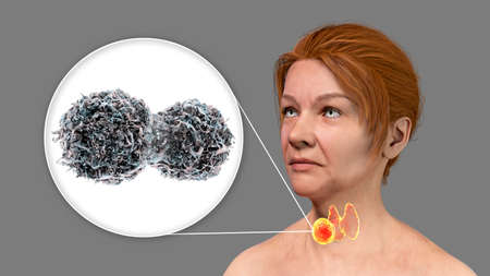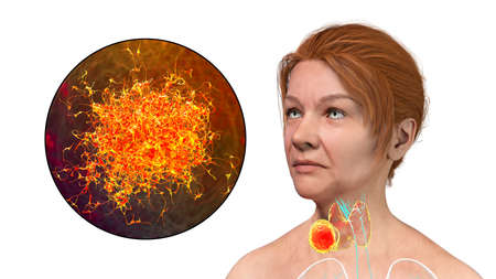 Thyroid cancer, 3D illustration showing tumor inside thyroid gland and closeup view of cancer cells