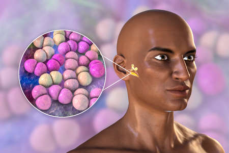 Streptococcus pneumoniae bacteria as a cause of sinusitis. 3D illustration showing purulent inflammation of frontal sinuses in an African man and close-up view of pneumococci bacteria
