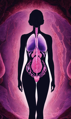 Human body illuminated with vibrant energy and glowing organs against a dark background
