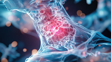 Intricate world of living cells in this closeup, showcasing glowing organic structures on a stunning blue background, revealing lives microscopic beauty