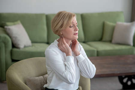 Blonde woman feeling unwell while suffering from pain in neck