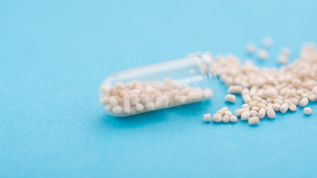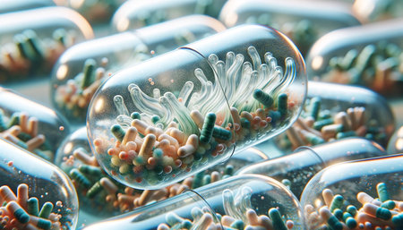 Close-up image of probiotic capsules, each filled with active rotating probiotics. The image reflects the theme of improving digestive health through natural supplements.