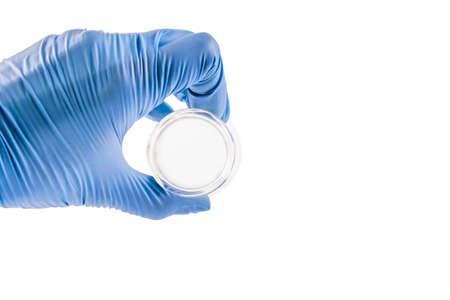 A hand in a gray medical glove holds a bottle of white powder, light blue background, space for text, top view.
