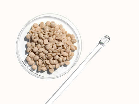 Nutritional yeast in Petri dish on blue background. Image with copy blank space.