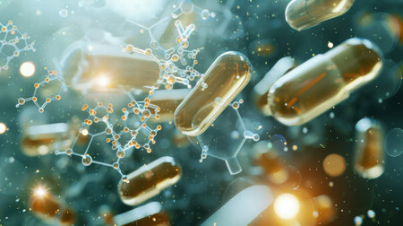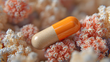 A vibrant orange capsule rests on a coral reef, showcasing an intricate marine scene that blends nature with health, creating a stunning underwater visual.