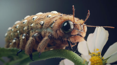 This stunning close-up captures a unique insect resting on a green stem with delicate white flowers, revealing intricate textures and vivid colors.