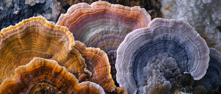 Close up view of colorful mushrooms showcasing intricate textures and patterns, emphasizing earthy tones and organic forms in a natural setting