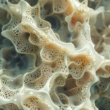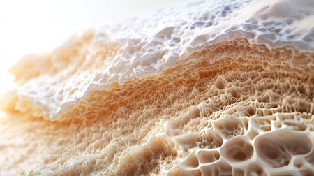 Photo showing close up of porous bone structure with medical lighting and shallow depth of field keywords:...