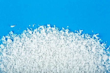 White snow on blue background, top view.
