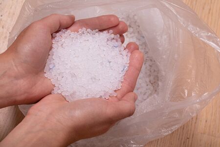 A person holds recycled plastic granules in his hands close-up, human plastic recycling, generative AI.