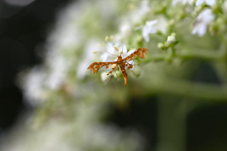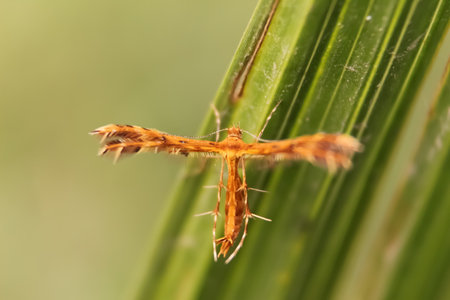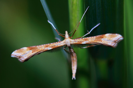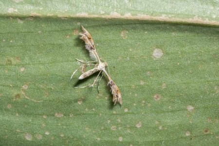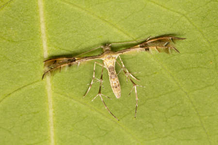 Macrophotography of a White Plume Moth (Pterophorus pentadactyla) with natural background.