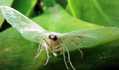 BEAUTIFUL WHITE MOTH ON BRIGHT GREEN LEAVES STOCK PHOTO