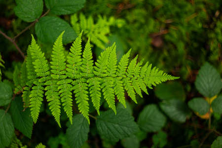 Lush green fern leaf in the forest. Top view close up shot, shallow depth of field, green background.