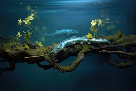 electric eel wrapped around a submerged branch, camouflaged, created with generative ai