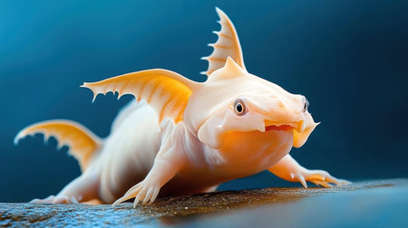 A close-up of an albino axolotl, showcasing its distinctive white and orange coloring, prominent gills, and unusual fin formations, against a blurred blue background.