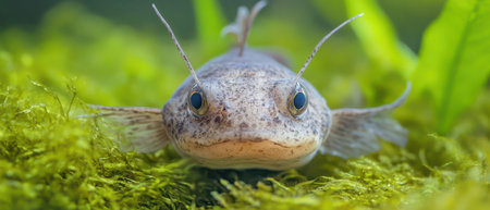 This freshwater fish features distinctive whiskers and large eyes gliding through vibrant green aquatic vegetation in a tranquil setting.