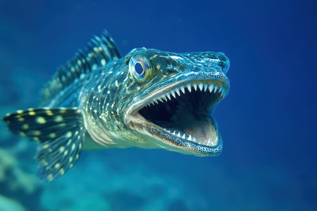 Underwater closeup of a predatory fish with open mouth, murky water, eerie lighting, detailed textures, natural habitat setting