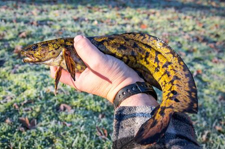 Caught trophy fishing on the hand of the fisherman. Black terrible monster fish.