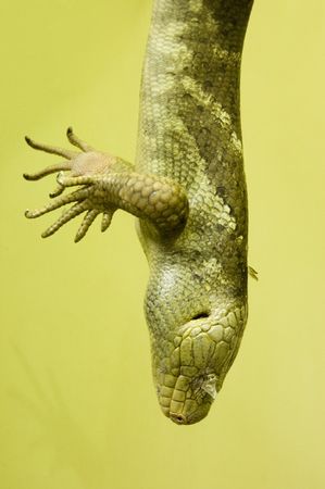 A green lizard hanging downwards with scaly skin covering its eye