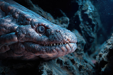 A striking underwater creature showcases its menacing teeth and intricate patterns as it navigates through its vibrant habitat. The play of light enhances the beauty of this aquatic predator.