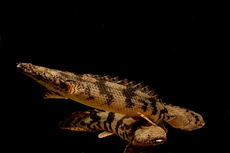 Snakehead fish (channa marulius) in aquarium. Wildlife animal.