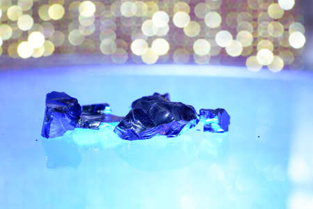 A close-up of raw, unpolished blue and gray gemstones with reflective surfaces. Light reflects off facets, creating a captivating play of colors, showing natural textures and details