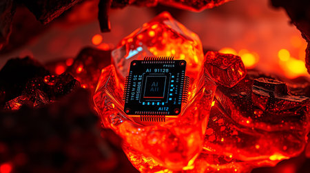 This image showcases a cutting edge artificial intelligence chip prominently displayed atop a cluster of fiery glowing crystalline formations The red and orange hues create a sense of intense heat and power symbolizing the immense processing capabilities and energy behind the AI technology The intricate details of the chip including its circuit patterns and connection points are clearly visible The background features blurred abstract shapes and colors emphasizing the focal point on the AI chip and the crystalline structure which could represent the future of technology and innovation or the raw energy that powers it Overall this is a compelling visual metaphor for the confluence of technology and power