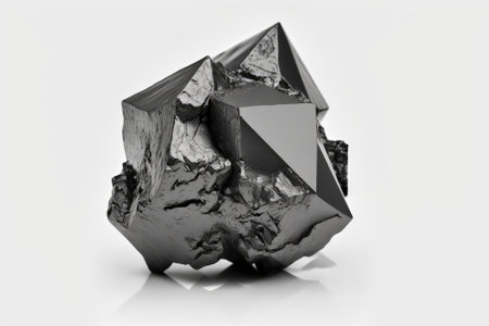 A single, unrefined specimen of a metallic mineral, showcasing its natural crystalline structure and brilliant, reflective luster. Isolated on a clean white background, this image highlights the raw beauty and industrial potential of geological resources, perfect for scientific, educational, or metallurgical themes.