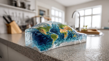 A stunning glass sculpture represents Earth, featuring detailed continents and oceans, adding a touch of artistic elegance to any modern kitchen space.