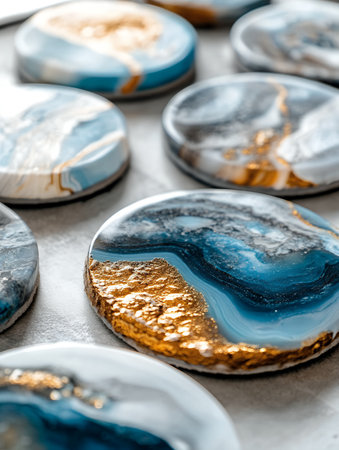 Beautifully crafted resin coasters with blue and gold accents, showcasing artistic design.