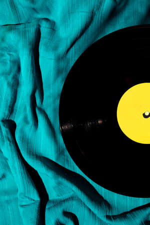 Layout of LP vinyl record on a cyan silk or saten fabric. Old vintage record.