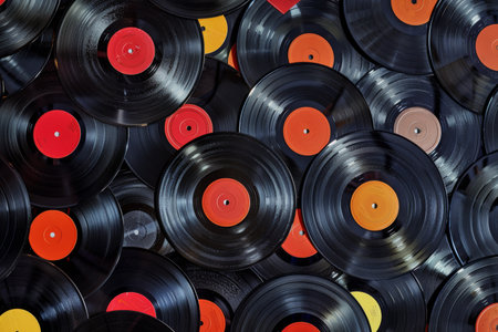 A collection of old records with a variety of colors and sizes. Concept of nostalgia and appreciation for the past