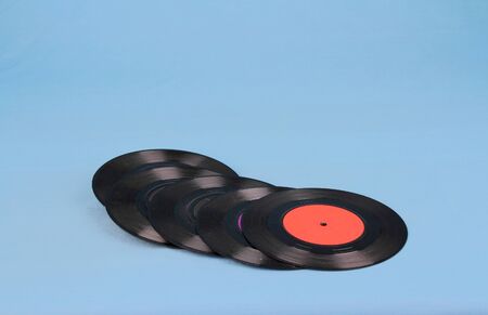 Vinyl records multiplied on soft blue background. Minimal abstract retro and vintage music concept. Retro technology idea.