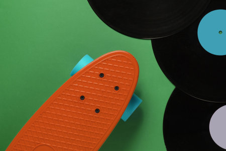 Cruiser board and vinyl records on green background. Youth retro style concept. 80s. Top view