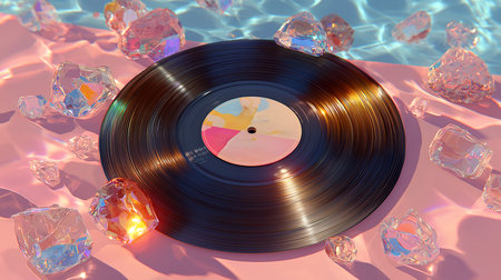 Classic vinyl record on bright colored background. Music composition with retro vinyl disc