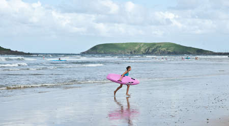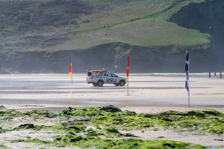 MAWGAN PORTH, ENGLAND - APRIL 16, 2019: Lifeguards on duty on Mawgan Porth beach, Cornwall, England, UK