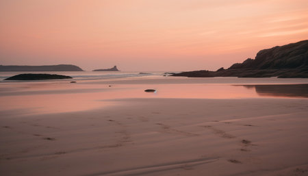 Sunset over the tranquil coastline, sand and water reflecting beauty generated by artificial intelligence