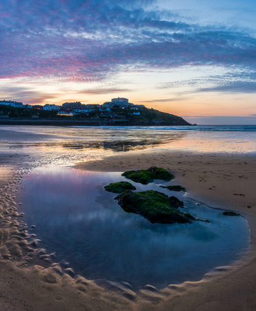 The beautiful sunrise over the floody ocean in Crantock Bay, Cornwall, UK