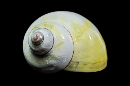 Detailed macro shot of a smooth, polished moon snail shell in white and pale yellow, highlighting its perfect spiral and whorl structure on a pure black background