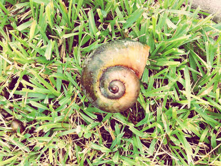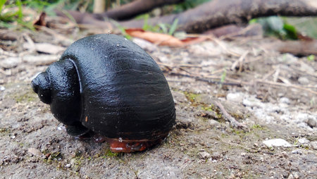 Closeup of a Snail shell in the dirt ,Foliage, Selective Focus, moody theme.